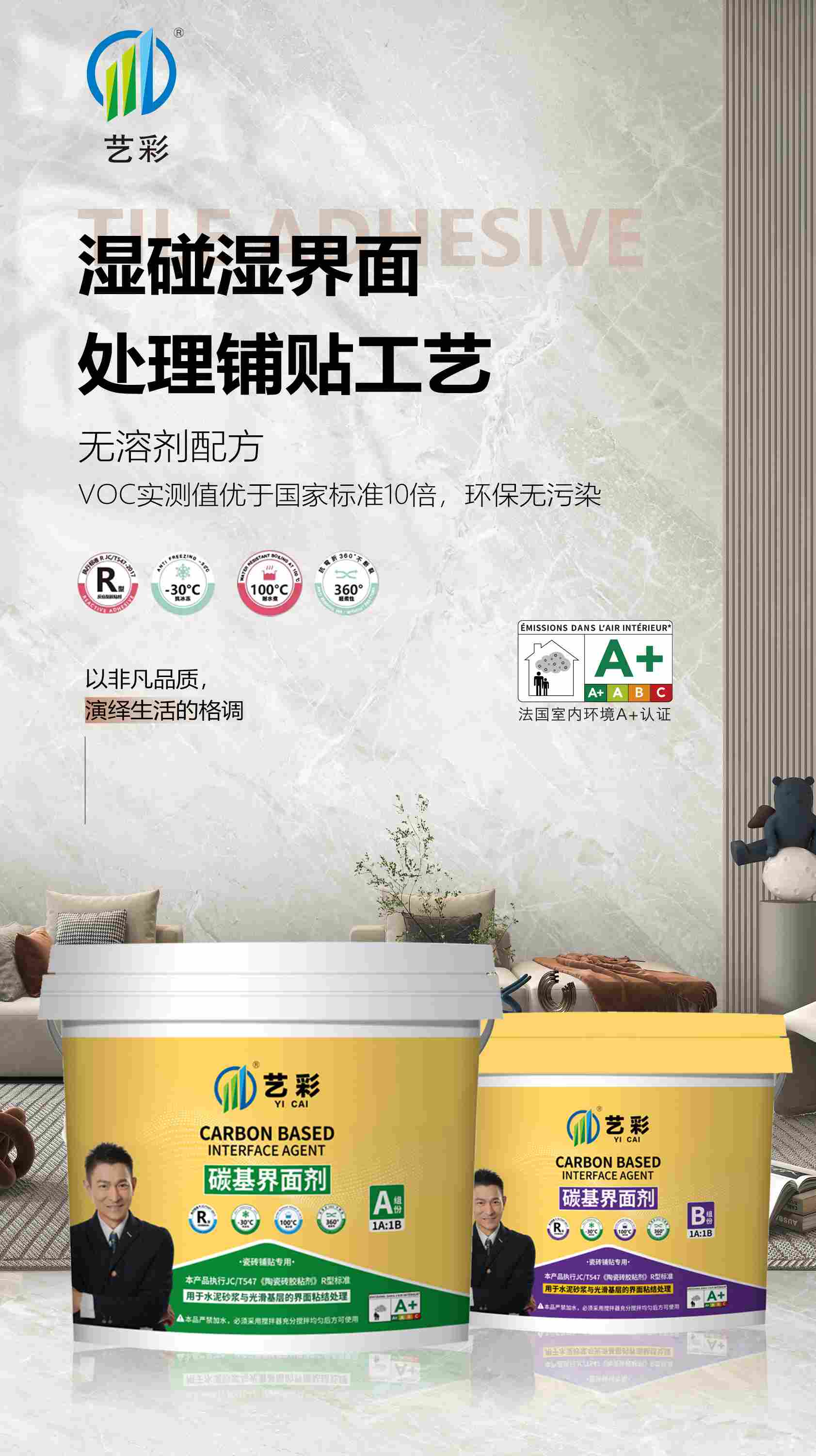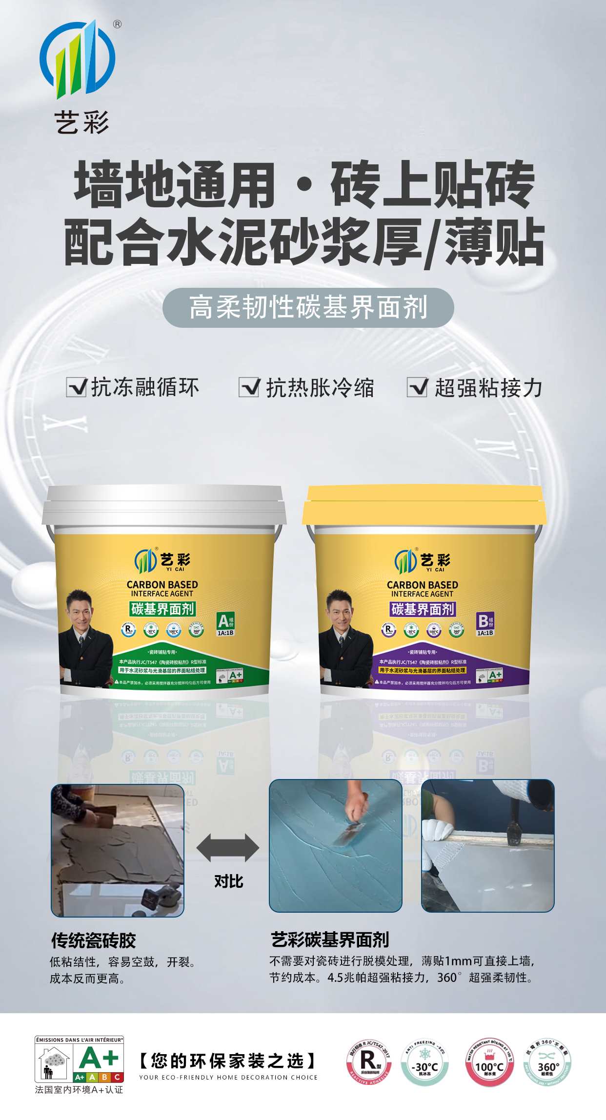 • 粘结强度高:构建五维粘结体系,新增化学键粘接和界面层活化技术,依据JC/T547-2017检测出的粘接力可达4.4MPa,是传统水泥基C1C2瓷砖胶的5-10倍。
